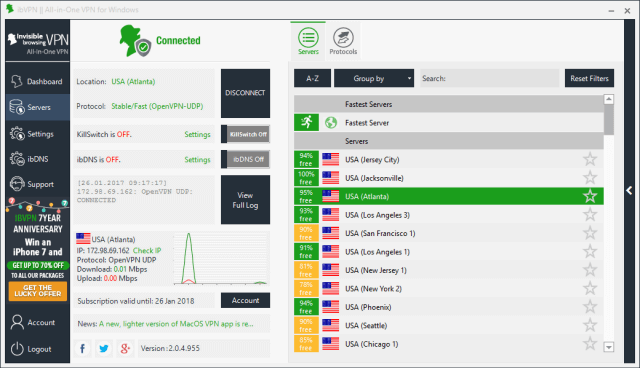 支持UDP、TCP、SS协议匿名上网,保护您的真实IP不被泄露,保护您的个人信息安全。允许用户从各种系统和设备进行连接,包括 Windows、Mac、Linux、iOS、Android、DD-WRT 路由器等等。